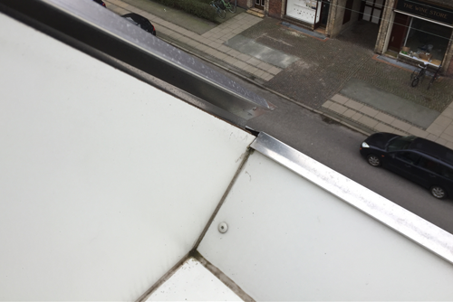 Der mangler fugtspærre over vinduet i skalmuren, eller der er kun anvendt en rende til at lede vandet ud.