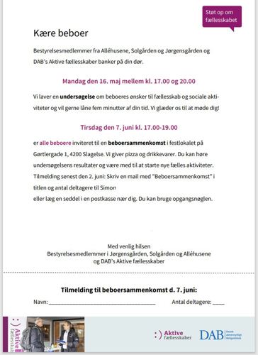 Undersøgelser fra DAB’s dør til dør-ture har vist, at 50 procent af beboerne godt vil give en hånd med til fælles aktiviteter. For eksempel ved at sørge for kaffe, bage en kage, stille stole op eller andre mindre opgaver. Samtidig svarer 25 procent, at de gerne vil være frivillige, bare de bliver spurgt.