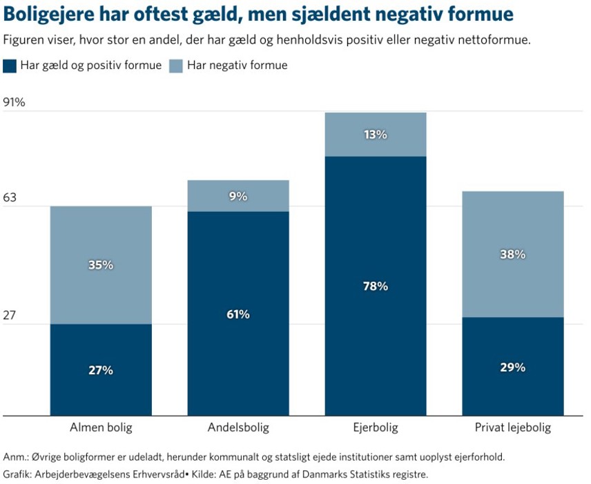 En ny analyse fra Arbejderbevægelsens Erhvervsråd (AE) – ’Hver anden forsørger i lejebolig er tynget af gæld’ - beskriver den økonomiske forskel mellem ejere og lejere.