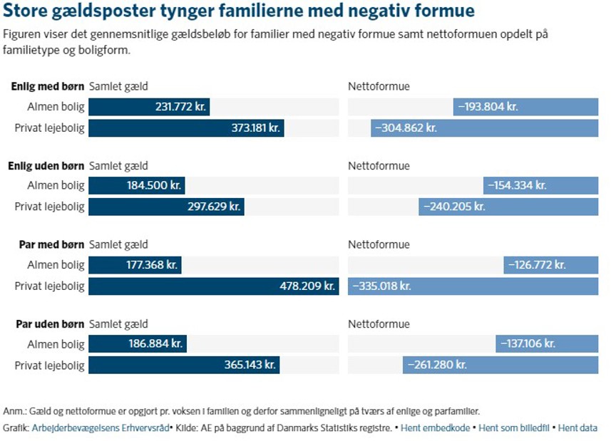På tværs af alle familietyper i almene boliger er den negative formue på over 100.000 kr., mens den for private lejere er over 200.000 kr. og altså over 300.000 kr. blandt børnefamilierne.